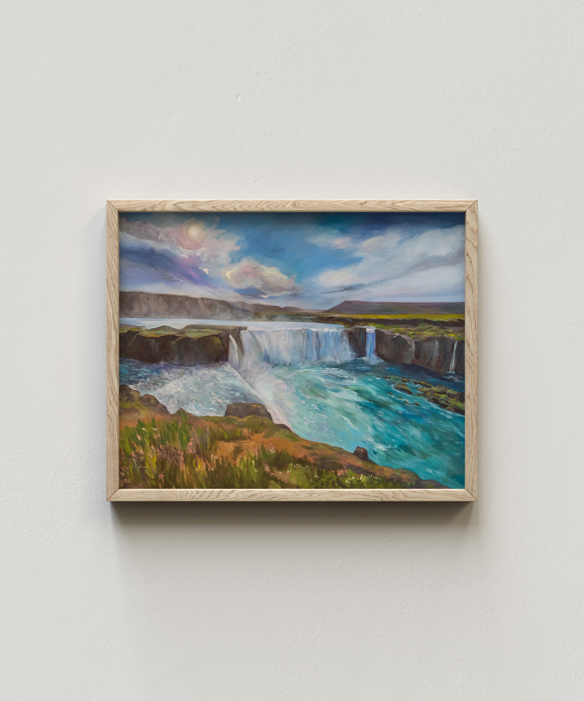 "Solace" captures the breathtaking Godafoss waterfall in Iceland, painted as a special commission for dear friends who spent two years living there. During that time, the falls became a place of refuge—where they would return again and again, finding comfort in its beauty and symbolically casting their troubles into the rushing waters.